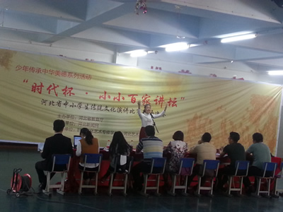 为深入开展中华优秀传统文化教育,大力培育和践行社会主义核心价值观,引导广大中小学生了解中华民族的文明历史和优秀传统文化,营造青少年敢于有梦、勇于追梦、勤于圆梦的良好社会氛围,河北省教育厅于2015年3月至9月举办了以“弘扬优秀传统文化,争做中华美德少年”为主题的“时代杯·小小百家讲坛”中小学生传统文化演讲比赛。比赛分为初赛、复赛、决赛三个阶段。